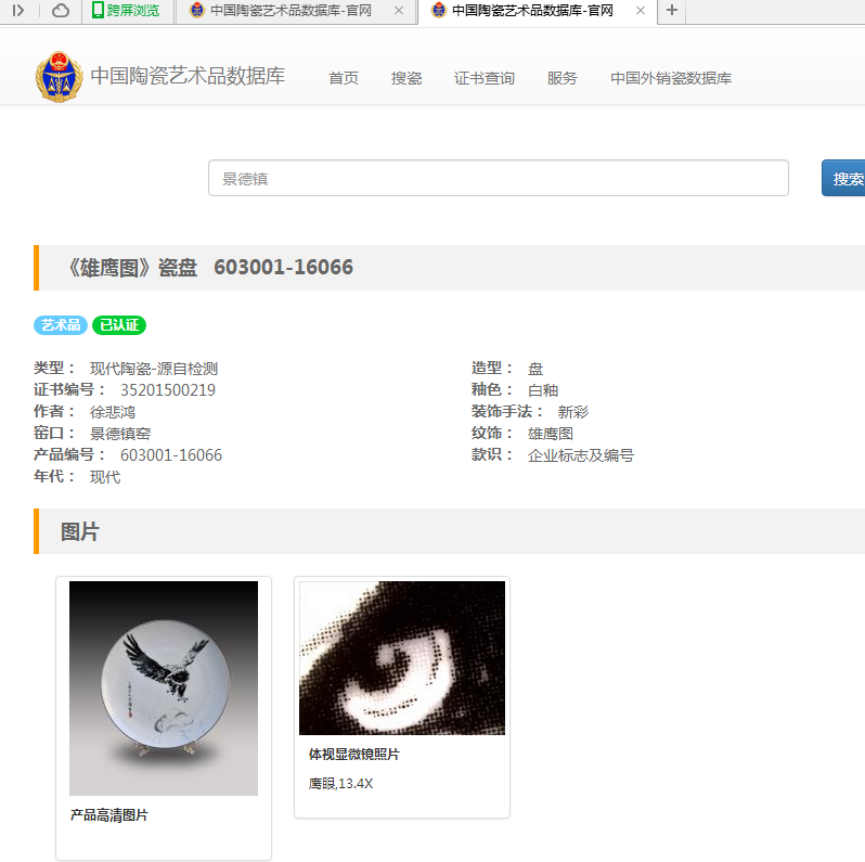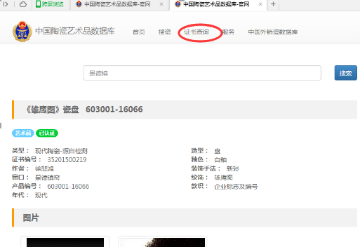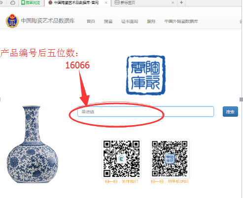 2、進(jìn)入中國(guó)陶瓷藝術(shù)品數(shù)據(jù)庫(kù)官網(wǎng)頁(yè)面,在圖二的選中區(qū)域輸入圖一中產(chǎn)品編號(hào)后五位數(shù)字“16066”,即可檢索到該編號(hào)產(chǎn)品可供對(duì)外查詢信息(每個(gè)產(chǎn)品對(duì)外可查詢一個(gè)體視顯微鏡照片數(shù)據(jù))