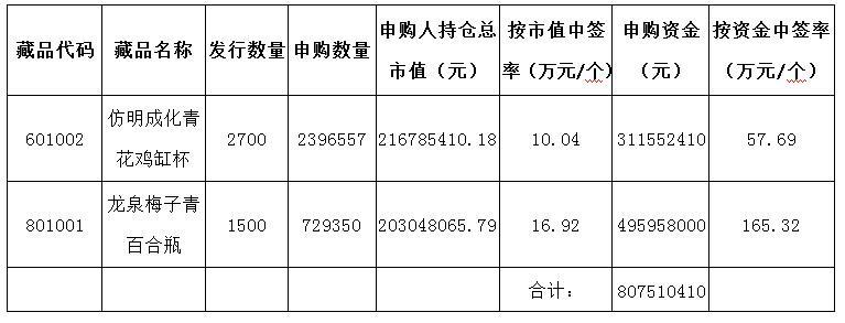 本次中簽分配方式按持倉市值優先分配規則,請廣大參與申購的投資會員關注交易賬號中持倉數量和資金變化情況。《仿明成化青花雞缸杯》、《龍泉梅子青百合瓶》將于2016年9月26日正式掛牌交易。