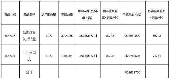 本次中簽分配方式為45.45%按持倉市值分配,54.55%按申購資金分配,請廣大參與申購的交易會員關(guān)注交易賬號中持倉數(shù)量和資金變化情況。《張國輝青花書法盤》、《七葉荷口洗》將于2017年4月8日正式掛牌交易。