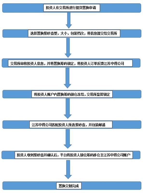 為了保護(hù)線上投資人的利益,促進(jìn)線上線下的流通,江蘇中得文化發(fā)展有限公司聯(lián)合景德鎮(zhèn)陶瓷交易所(以下簡(jiǎn)稱陶交所)將推出“線上泥料藏品置換”活動(dòng)。持有(編號(hào)501001)黃龍山紫泥鯊皮青、(編號(hào)501002)中鼎底槽清紫砂泥藏品的投資人申請(qǐng)?zhí)嶝洉r(shí)可以選擇直接提取紫砂泥料,也可以與線上泥料制作的紫砂器物進(jìn)行籌碼置換。